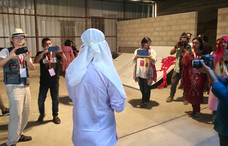 While my performance was going on, a poem was playing on the speakers. The poem is by the famous poet of Bangladesh, Shamsur Rahman. As the subject of the poem, it can be seen that the poet was talking about a friend who left his own country. He could not stop the friend from leaving. As the poem went on, I walked through the crowd and finally stood on a white box with a stream of red flowing from my head. This red color symbolized the shedding of people who were forced to leave their own country and migrate to other countries. Or still being forced to leave.